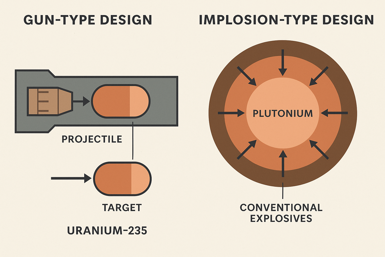 Una bomba all’uranio (come “Little Boy” su Hiroshima) è più semplice da costruire, grazie a un design a “cannone”: due masse subcritiche vengono unite rapidamente per formare una massa critica. Una bomba al plutonio (come “Fat Man” su Nagasaki) richiede un design a implosione, molto più complesso dal punto di vista tecnico, ma più efficiente.